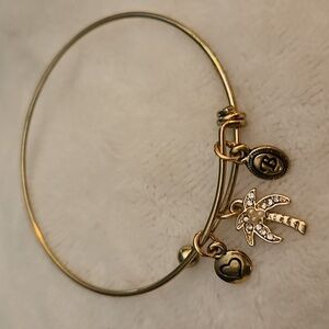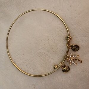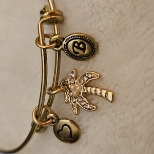 Elegant goldtone bracelet featuring a palm tree charm with rhinestones, a heart charm, and an initial charm.