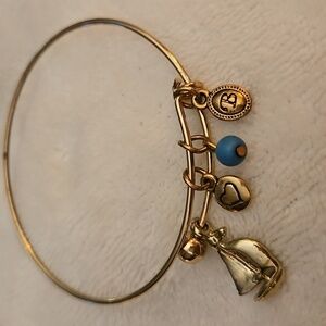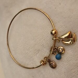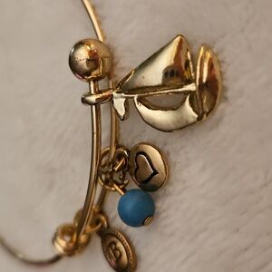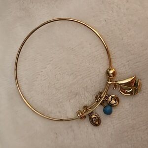 Elegant goldtone bracelet featuring a sailboat charm, a heart charm, and an initial charm.