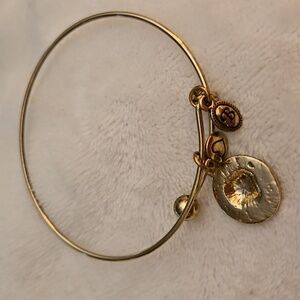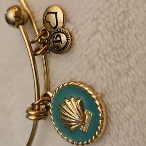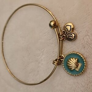 Elegant goldtone bracelet featuring a seashell charm, a heart charm, and an initial charm.