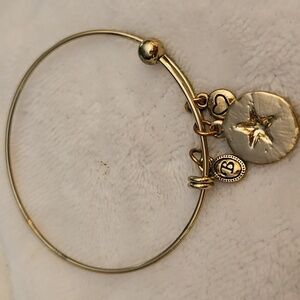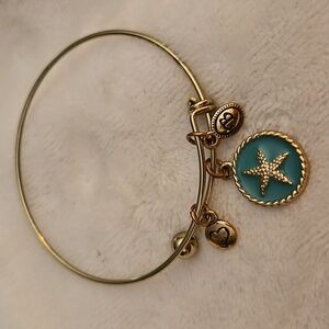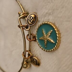 Elegant goldtone bracelet featuring a starfish charm, a heart charm, and an initial charm.