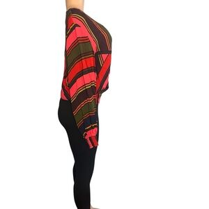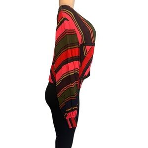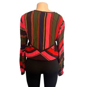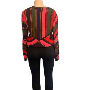 Elevate your style with this vibrant striped V-neck top. Featuring a mix of red, pink, and green hues, this top is perfect for any occasion. Enjoy the comfort and fashion-forward design.