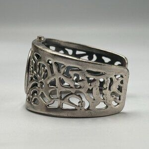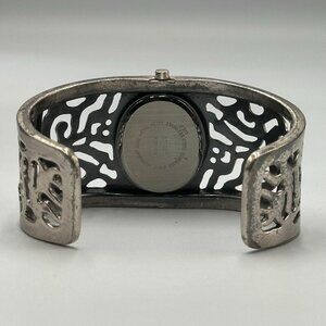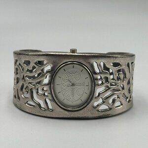 Cuff Bracelet Watch Women Silver Tone Filigree Cutout Design Oval Case Working
