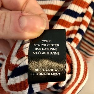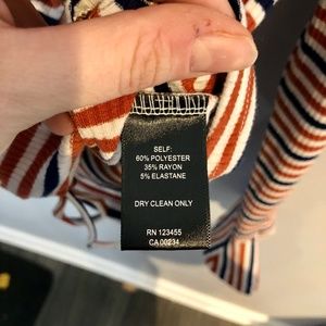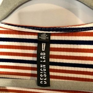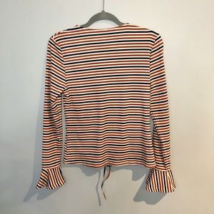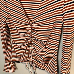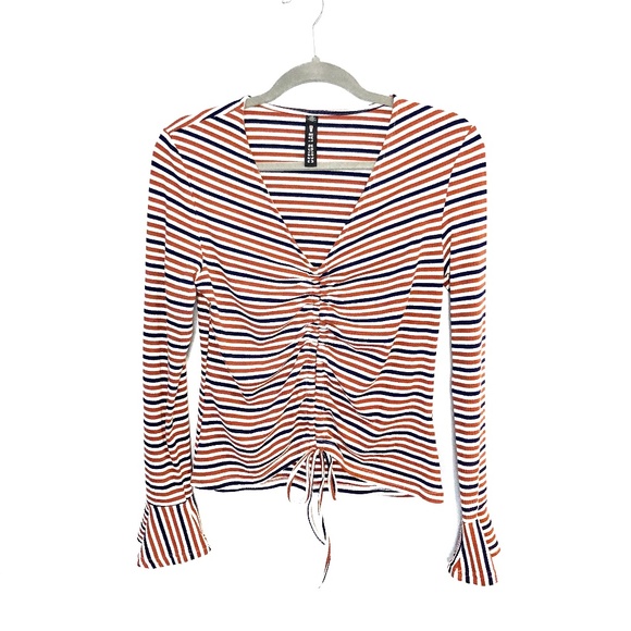 Design Lab Striped Ribbed Adjustable Crop Top. Love the details on this - the shirring in the front, the ribbing, the bells at the wrists. With Navy and burnt orange stripes. The strings in the front mean you can adjust how much of a crop top you want this to be - genius! In excellent pre-loved condition.