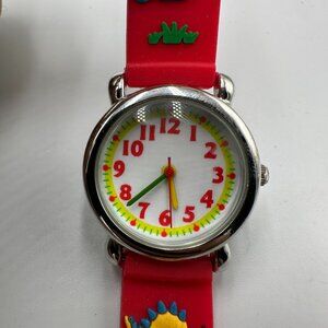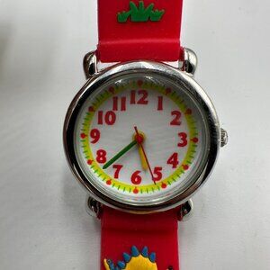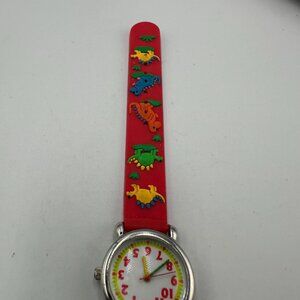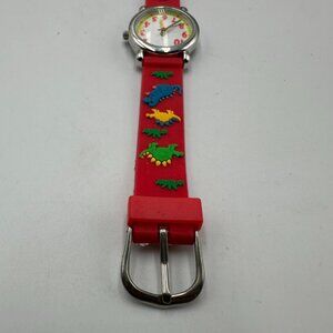 3/$30 Dinosaur Watch Boys Silver Tone Red Band Easy To Read Dial 7.5"