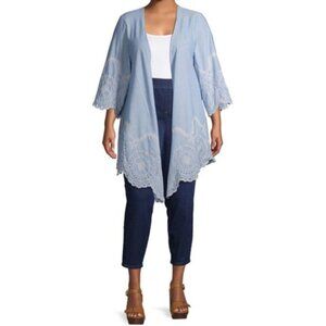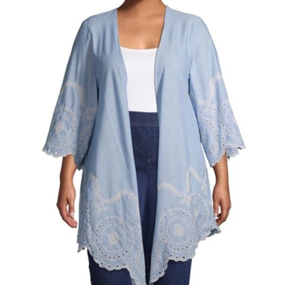 Featuring embroidery details, relaxed fit, open front, short sleeves, and scalloped hem. ~ 37” long. Polyester.