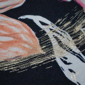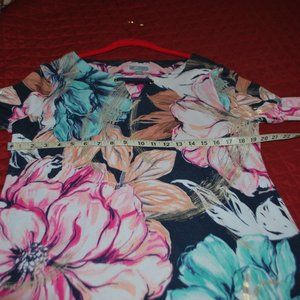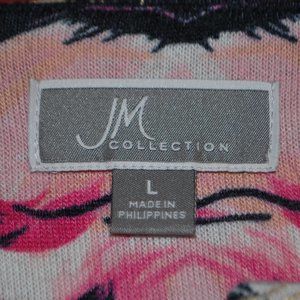 This top has gorgeous large flowers in shades of pink, turquoise and tan on a black background. Metallic gold swirls in the pattern catch the light. Rounded neckline with a keyhole opening in front with a black insert and gold grommets. Rounded hemline. This is a heavier weight top so could be worn year round. Machine wash and dry. By JM Collection, size L. EUC.