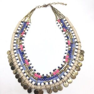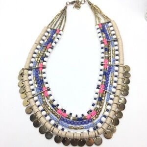 Beautiful HOT PINK BLUE SEQUIN BEAD COIN BIB TRIBAL NECKLACE. cheerful hot pink, cream, white and blue sequins and beads coupled with gold tone brass coins and beads. Antiqued brass finish. Measures: 16" around the neck, 3" extender. Bohemian, boho, tribal, ethnic, Anthropologie style, festival vibes! Great condition, there is some loss to the gold plating on the clasp, please see photos for details but does not deter from wear the awesomeness of this piece.