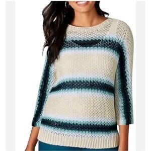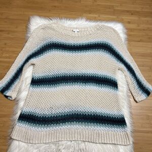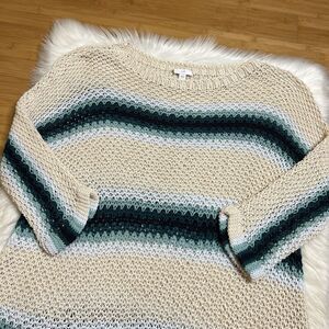 Crochet Knit 3/4 Sleeve Pullover Sweater. Tan Blue Striped Ombre