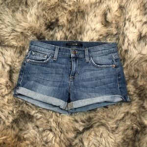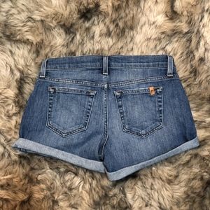 Can be worn rolled up or down. Denim is super soft and fairly stretchy. Mid rise.