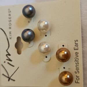 Set of pearl stud earrings by Kim Rogers. Includes bronze, white and gray colors. Perfect for sensitive ears.