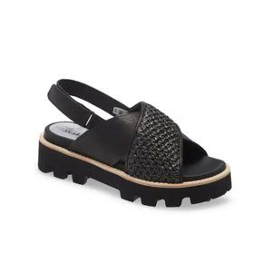 La Montelliana Ambra Slingback Sandals in Raffia Black. Mixed-media straps-one leather and one woven raffia-crisscross atop this lug-sole slingback sandal that offers contoured support and lightweight comfort.