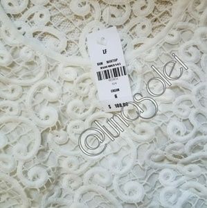 Brand new w/ tags. Delicate ivory sleeveless high low top. Bodice features scroll detail & chunky open net scroll weave. Cropped front w/ longer semi-sheer train in the back. Front is lined w same material as train. Back is open. Beachy feel and funky vintage vibe. 100% Polyester. Retailed for $108 at LF. By Rumor Boutique.