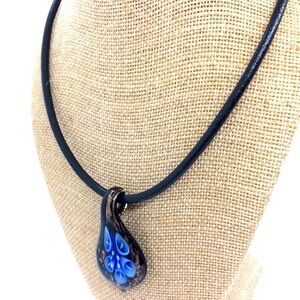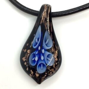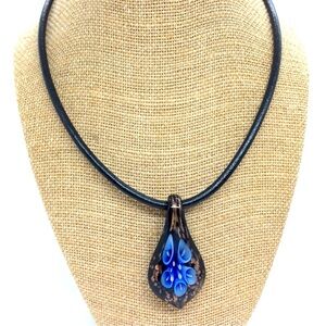 Stunning MODERNIST FAUX LEATHER CORD ART GLASS FLOWER MOTIF PENDANT NECKLACE, featuring a unique, eye-catching art glass pendant adorned with a delicate blue and black flower motif. The pendant hangs beautifully on an 18-inch faux leather cord, finished with a gold-tone clasp. This unmarked beauty combines a bold design with feminine floral art glass detailing, perfect for any fashion-forward jewelry lover looking to make a statement.