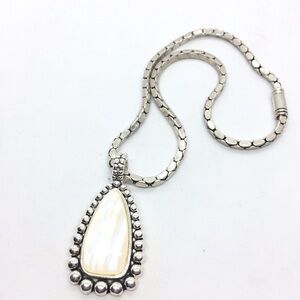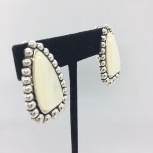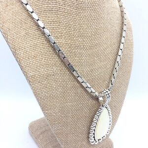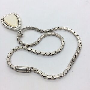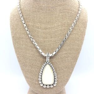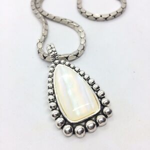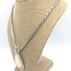 Gorgeous MOTHER OF PEARL MOP STATEMENT SILVER TONE PENDANT CLIP ON EARRING SET. Earrings are clip ons. Antiqued silver tone. Necklace 16” around neck, pendant 1” at widest point x 2” h, earrings 1” at widest point x 1.5” h. Magnetic closure on the necklace, easy on, easy off. Stunning set to highlight your face and add some delight to your wardrobe.Condition: Some light wear from normal use but does not deter from the beauty of this set.