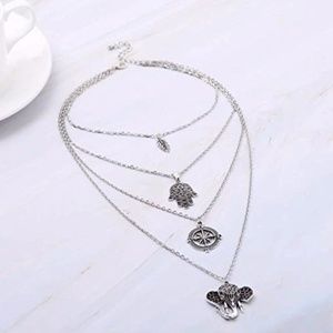A silver multi layer necklace with an elephant, compass, hand, and leaf.