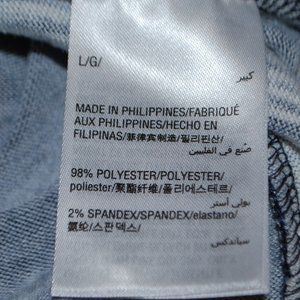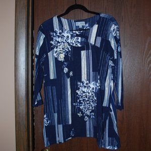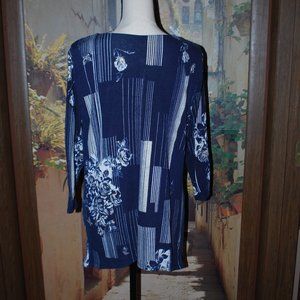 Navy background with pretty vertical white stripes and flowers plus some metallic gold also. Features a rounded neckline with a peekaboo opening. Bottom has a subtle shark-bite hemline. Machine wash and dry. By JM Collection, size L. EUC