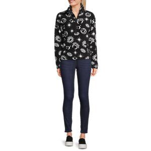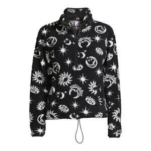 Featuring relaxed fit, mock neckline, pullover styling with quarter-zip closure, front pocket, drawcord waist, and allover print. Polyester.