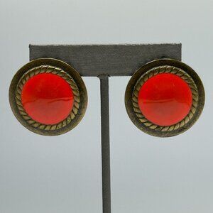 Reddish Orange Stud Earrings Brass Tone Pierced Large Round Nautical Button