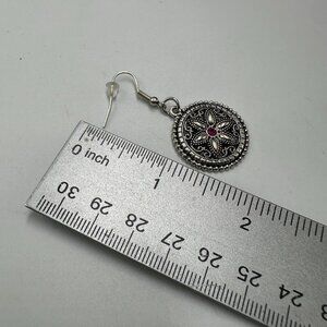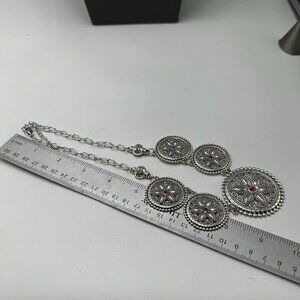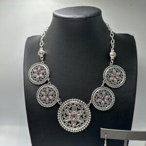 Silver Tone Necklace Earring Set Medallion Disc Statement Jewelry Pink Accent