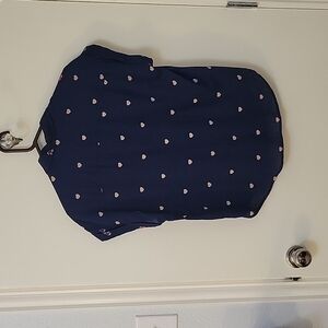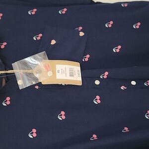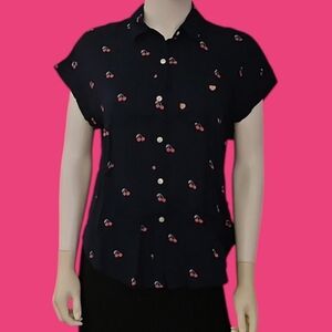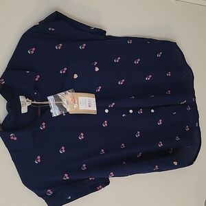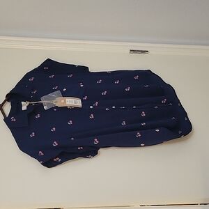 3/$30 TRUE CRAFT Navy Blue Pink Cherry Button Down Oversized Short Sleeve Shirt