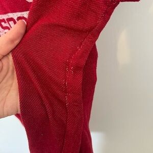 OU t-shirt with scoop neck and soft, drapey fabric. There’s a small bleach spot on front, please see pictures. Wouldn’t be noticeable if tucked in or cropped! But honestly I wore it out with the bleach spot and no one seemed to notice. The material is so soft and perfect for watching from the stands or the sofa.