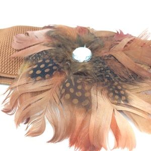 Beautiful VINTAGE 90S FEATHER STRETCH BELT WIDE BROWN CINCH RHINESTONE. Faux leather and stretch elastic material. Genuine bird feathers, acrylic clear rhinestone center. Measures approximately unstretched 28" around, can stretch up to 29" comfortably, 3" wide. Hook closure. Great vintage condition with one of the feathers slightly bent and some slight fuzzing of the faux leather of the material on the back of the belt but is hardly noticeable when worn due to the pattern and texture of the belt but does not deter from wear or the fabulousness of this piece. N5