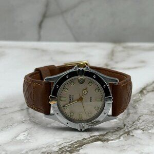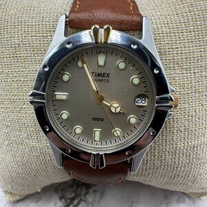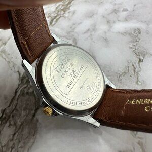 3/$30 Vintage Timex Watch Women Silver Tone Date Brown Leather Band 8.5"