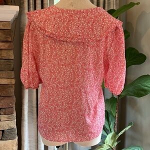 WAYF medium pink floral peasant style button down shirt. Wide collar with ruffle detail. Short sleeves.