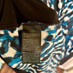 Size Large. Front of top is solid black. Back of top has decorative buttons from top to bottom and a catchy blue design. Great condition! See last photo for additional item description.