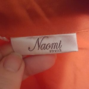 Vibrant orange color Button down top, quarter length sleeves, faux pocket detail at top, slit at bottom front for comfortable fit, fabric had stretch to it.