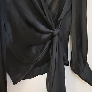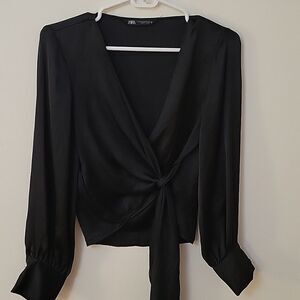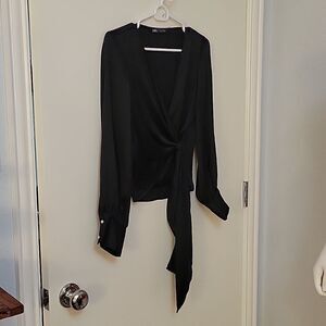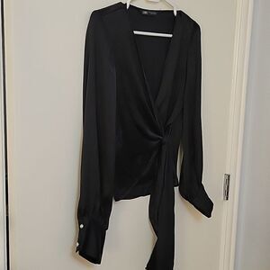 3/$30 ZARA Black Disco Satin Pearl Button Crossover Waist Tie Holiday Blouse