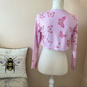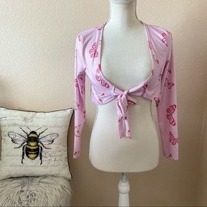 3/30 shein Tie Front Butterfly Print Ribbed Top