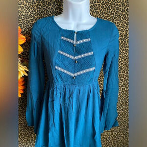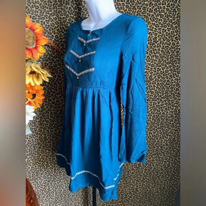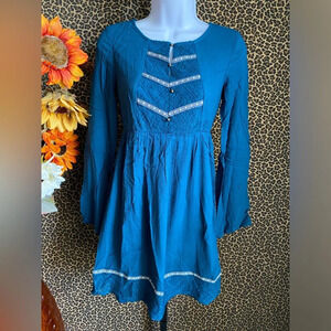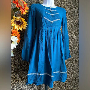 🌴3/$30🌴DOE & RAE Teal Blue Western Long Open Bell Sleeve Lace Trim Dress NWT