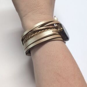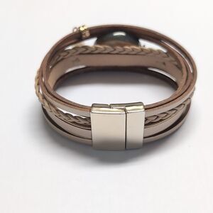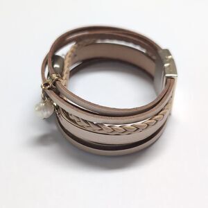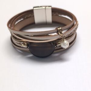 Multistrand Brown Stone with Pearl Accent Cream Leather Cuff Bracelet