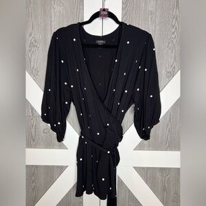 Stylish black wrap top with white polka dots. Features a flattering V-neck and tie waist.