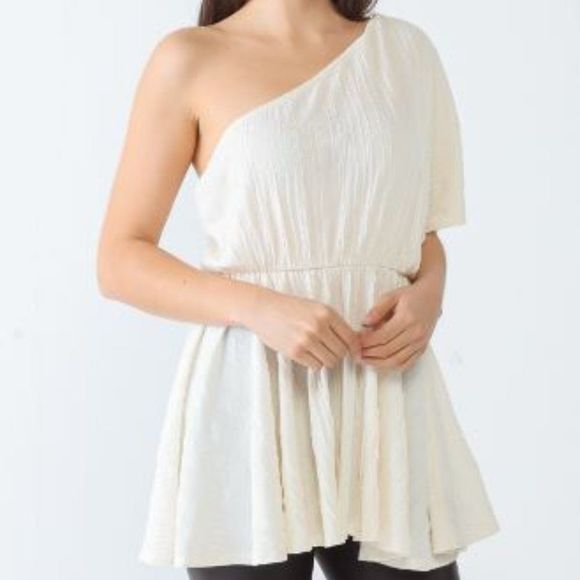 #33 Cream Textured One Shoulder Dolman Sleeve Flare Hem Top