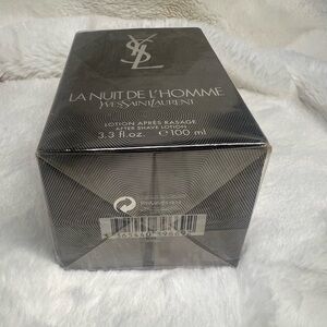 Yves Saint Laurent La Nuit De L'Homme after shave lotion in sleek black packaging. Perfect for a refined grooming routine.