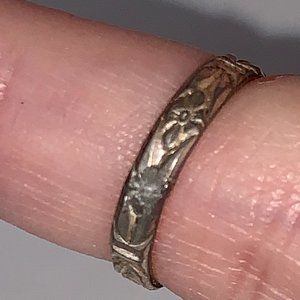 This tiny sterling silver ring is made out of Pattern wire with a bold floral design. These rings were made by a student and they used soft solder instead of silver solder so the ring joints are weak.