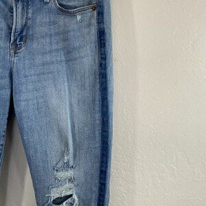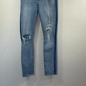 Jeans are medium wash, Distressed, Navy blue stripe on seam, Front/Back pockets, Button and zip closure