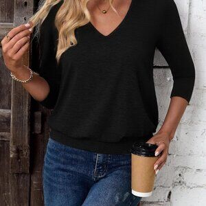3/4 Length Sleeve Womens Tops V Neck Blouse Banded Bottom Shirts Fashion Tunic 2