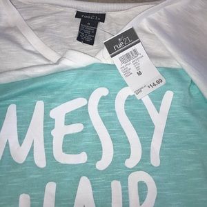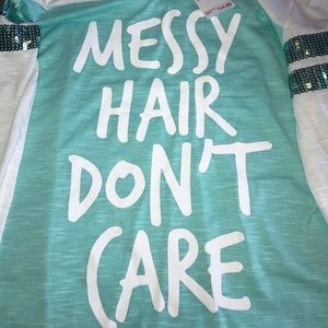 Sea green and white 3/4 sleeve sports' style Top. Messy Hair Don't Care!😉