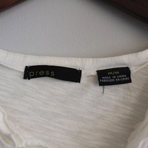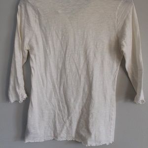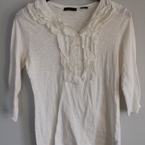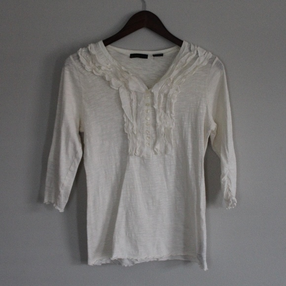 Off-white ruffle top with front button closure and 3/4 sleeves. Mild pilling in underarm area. Very cute as a solo top or under a sweater or jean jacket. Size medium, **fits like small.**