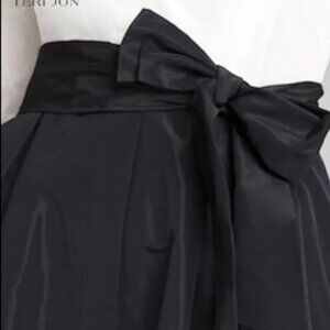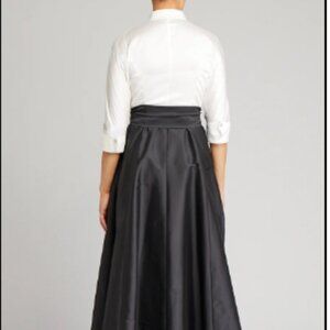 A gorgeous classic taffeta color blocked gown with a 3/4 sleeve collar and a tie at the waist.