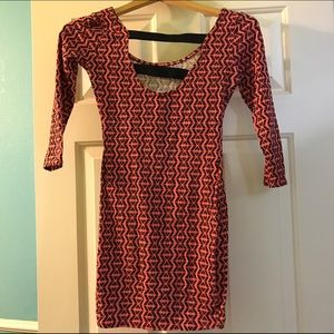 This is a super cute pink/coral dress, with black designs and a black strap in the back. This is a tight dress with 3/4 sleeves, and it's a stretchy material for a comfortable fit!