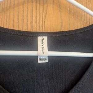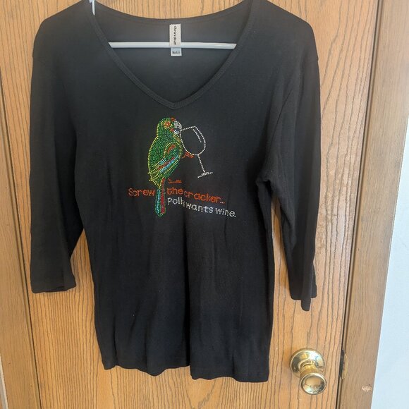 3/4 Sleeve V-Neck Black T-Shirt with Beaded/Sequin Graphic-Parrot- Medium