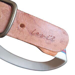 This vintage Levi's belt showcases the timeless combination of leather and canvas, with a classic brass buckle. The cream canvas is elegantly accented by a multicolor stripe, making it a nostalgic accessory for those with an eye for retro style.