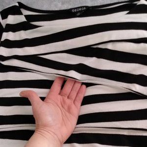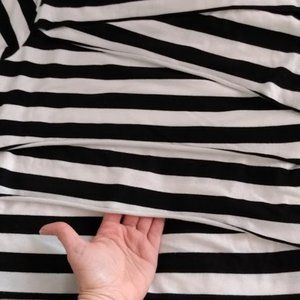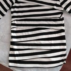 Black and white striped top with 3/4 length sleeves. Layered look on the front but flat on the back (as seen in photos).