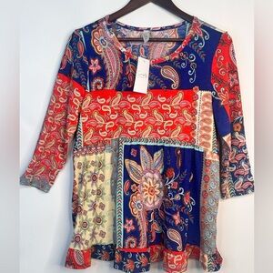 3/4 sleeve multicolor baby doll top with pattern block size M simply obsessed