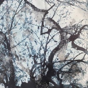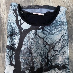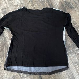 This is from French brand Camaieu. Back and sleeves are made of a soft black t-shirt material, the front is printed with a Japanese style print and embellished with transparent sequins in places. The front feels like silk, though it is not real.