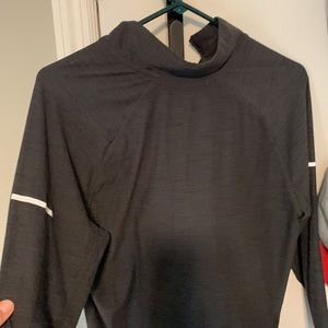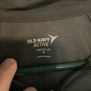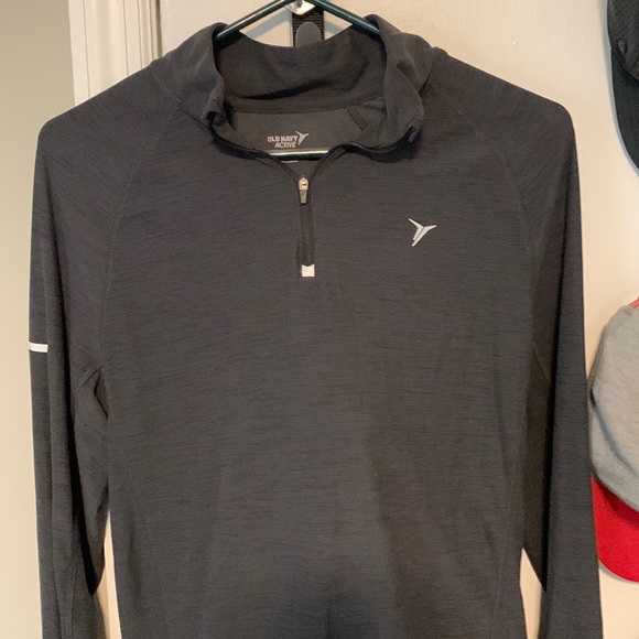 Old Navy Active 3/4 zip pullover. Pullover has raglan sleeves. Worn only a few times, medium too small for me. Clean, smoke free home. Great for running or working out. Reflectors for running at night and thumb holes. Size is medium. Color is like a charcoal gray/light black.